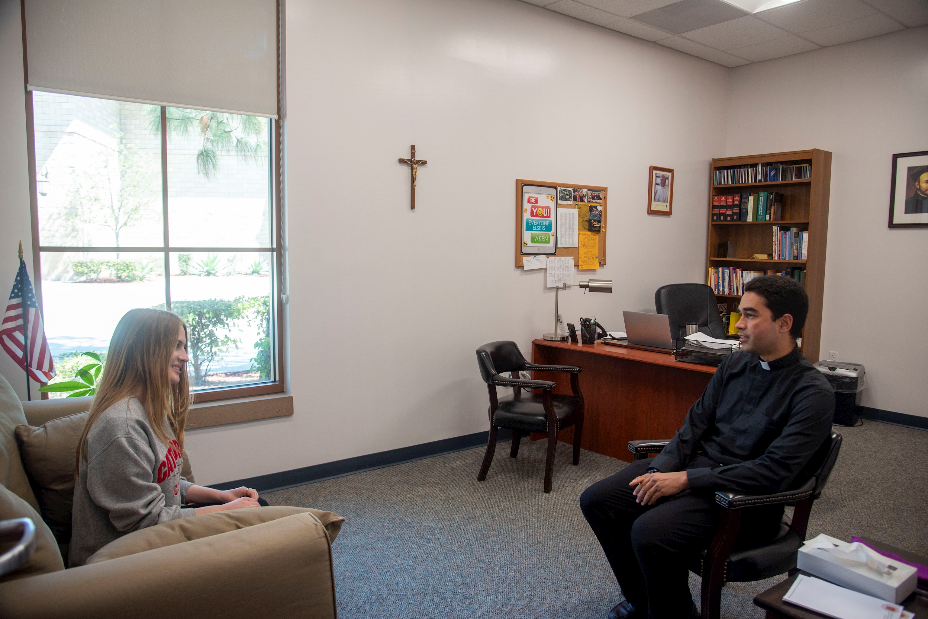 Fr. Matthew speaks with a student about what she is currently learning in religion.